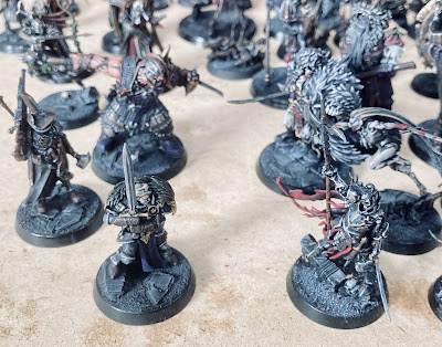 My method for all the models was pretty similar. After building and adding a bit of detail to the bases (plasticard for some broken paving stones, sand for the rest), they get sprayed black (naturally), then drybrushed fairly heavily in grey. I used that grey to guide what areas of the model got painted and what was left black. There were some additional washes or layers for some colours, but most of it was a single coat over the grey. The whole miniature then got lathered in nuln oil, before some particularly important highlights were once again picked out (e.g. edges and creases of robes, edges of swords etc).