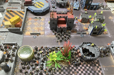 Deployment - as mentioned, I spent some CP to keep some reserves. The Lootas went into Strategic Reserve, while one of the 30 Boy mobs went in the Tellyporta. The Stormboyz would drop from the skies, and the Kommandos deployed sneakily forward behind the central ruin. The Space Wolves put some units on the flanks (notably a unit of Grey Hunters on an objective on the far left flank not seen in the pictures) while the other Grey Hunters were outflanking with wolfy cunning, or whatever that stratagem is called.