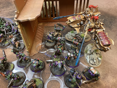 An interesting, fun game of Orks scoring heavily early and then Custodes racing to try and catch them at the end, and of course as usual with JP the game looked great. A good bit of practice before the tournament next month - though I am a bit torn on what to actually take. I'd love to run a list similar to this, but with so many models it's a bit of a logistical struggle to move between games etc. I'm worried that there won't be much space between tables and if I'd just piled up my dead on the board in this game it would have been about a quarter of it covered! Stuff to think about for sure.
